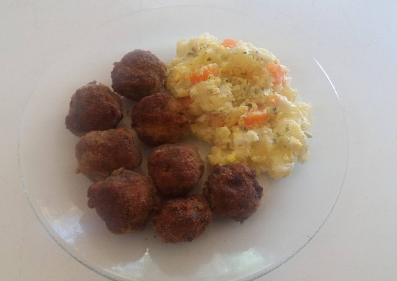 - En bowl carne molida, 2 huevos, 100gramos de pan rallado, cuchra de mostaza. Provenzal, orégano. Unimos todo. Luego armamos bolitas.