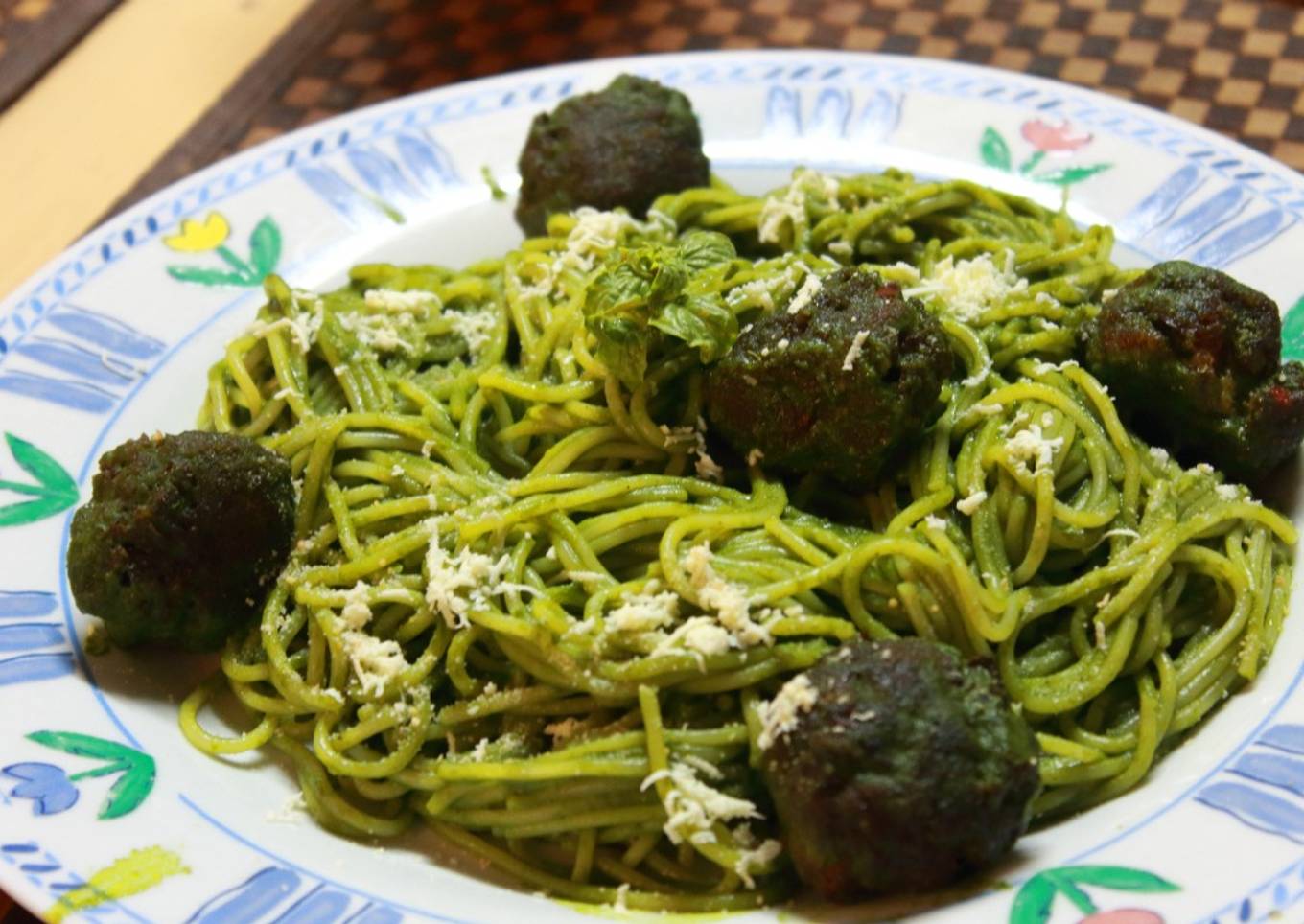 - En un recipiente con aceite las ponemos a freír las albóndigas y cuando estén listas las retiramos, calentamos la salsa verde y agregamos allí las albóndigas, paralelamente vamos haciendo la pasta y cuando este lista la salsa ya caliente y la carne ha tomado el sabor de la salsa pasamos a emplatar