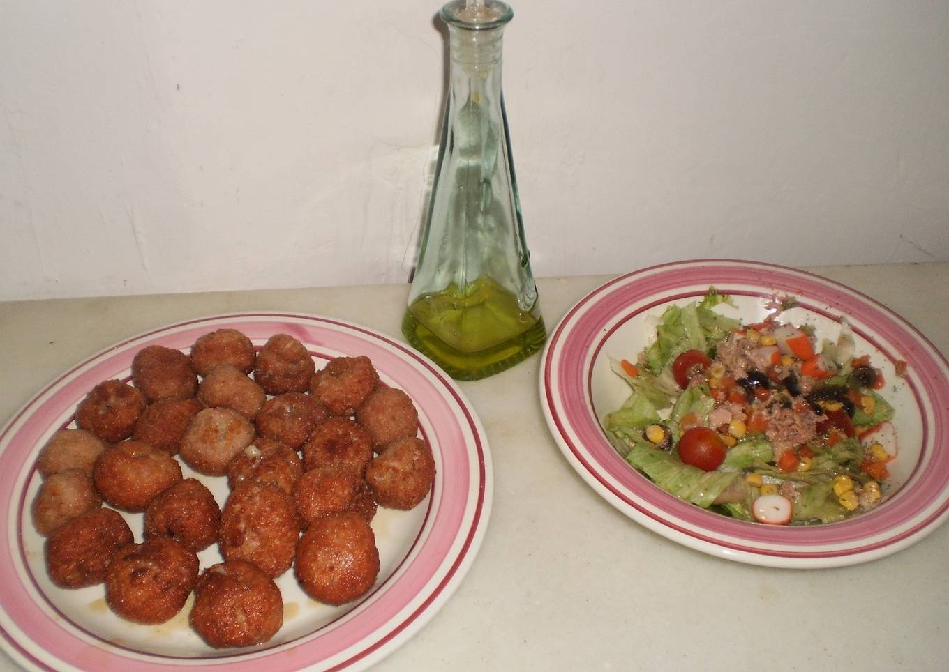 Albóndigas de pollo rellenas de queso cremoso, rebozadas y fritas, se sirve con una ensalada de hojas verdes.