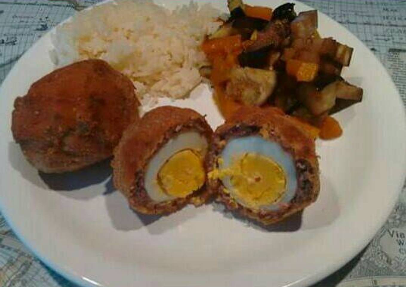 - Pelar los 6 huevos duros. Recubrir cada uno con carne picada, hasta lograr que quede completamente tapado.