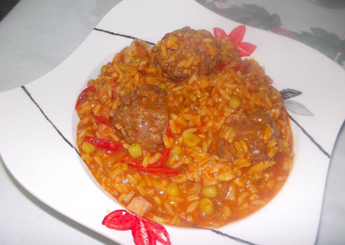 - Para la preparación: Poner la olla a calentar con aceite, cortamos la cebolla y morrón en julianas bien finitas y ponemos a dorar, agregamos la panceta y el chorizo doramos cuando este dorado, sellamos las albóndigas (así como esta en la foto).