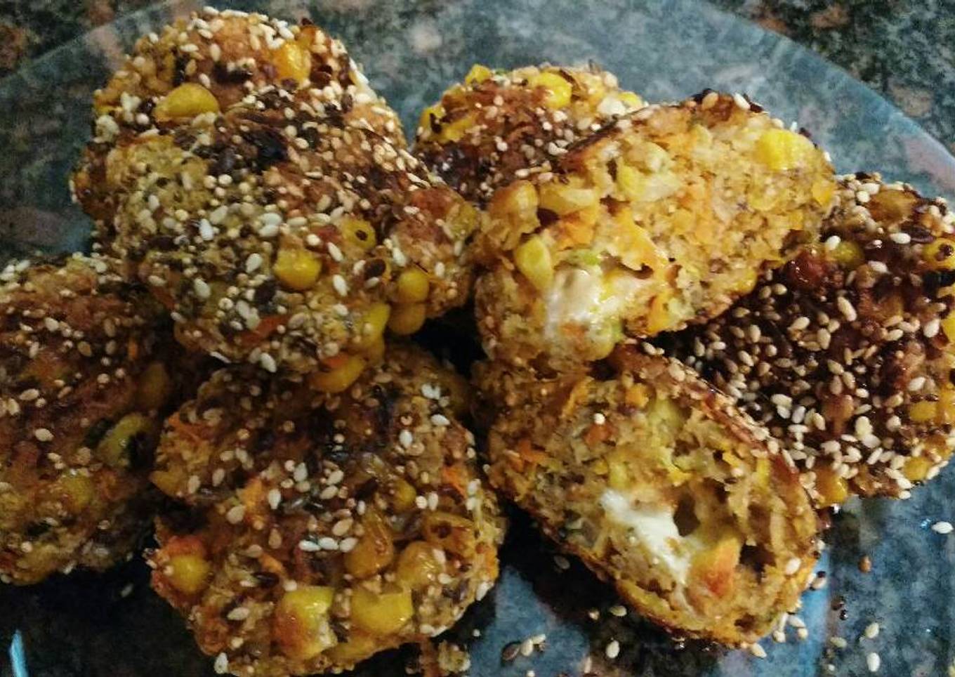 - Formamos las albóndigas con las manos haciendo un hueco y agregamos un cubo de queso. Rebozar en el mix de semillas.
